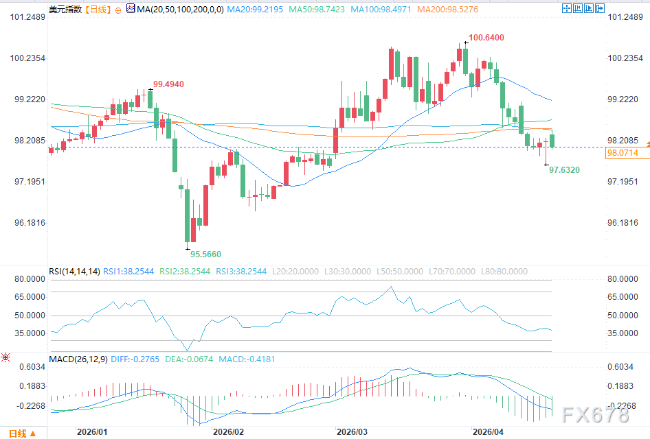 汇通财经APP讯——周一(4月20日)美市盘中,美元指数逐步走低,彻底回吐了早盘全部涨幅。市场开盘表现强劲,承接上周五尾盘的反弹趋势继续上行,但买盘力量在触及98.395点位后快速衰竭,该点位略低于200日均线98.524与50日均线98.732,多重关键技术压力叠加新手入门注意事项,直接压制了多头的上攻节奏。